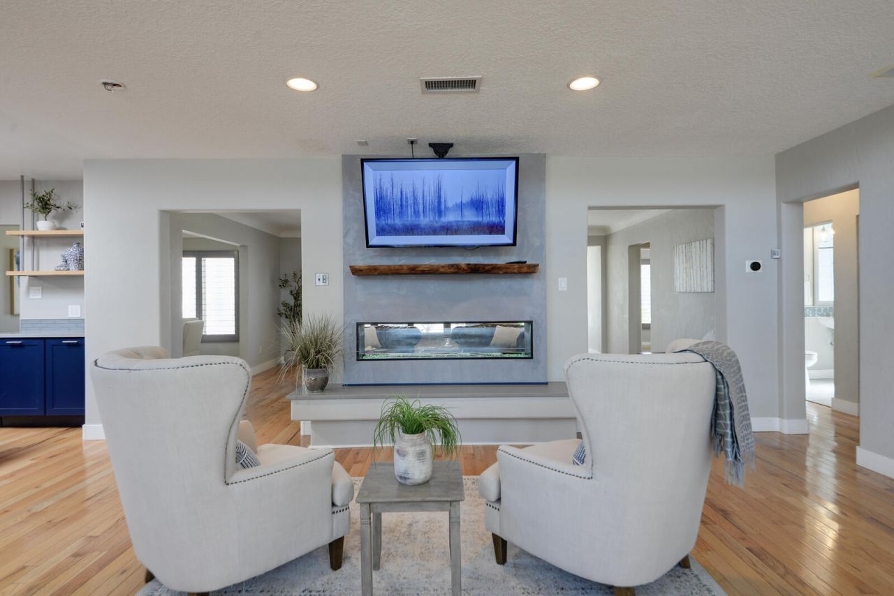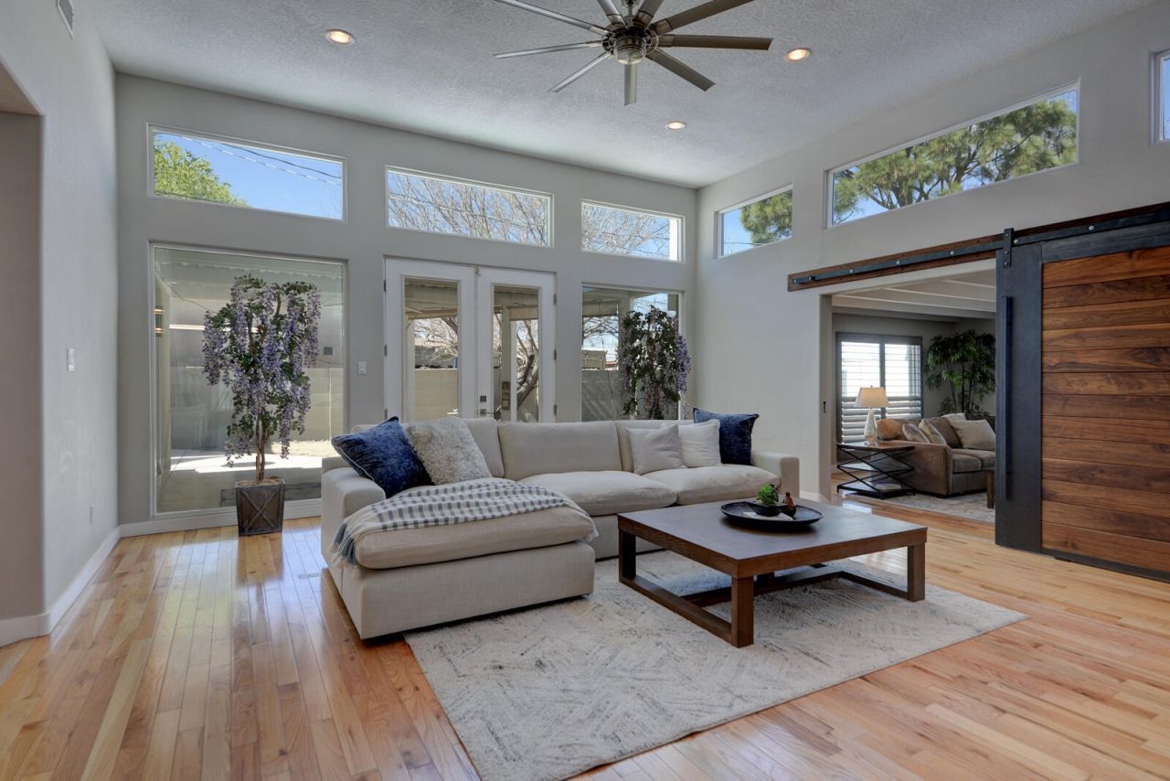 Experience sophisticated living in the prestigious Albuquerque Country Club! The living rooms are divided by a dramatic gas fireplace, plus a versatile bonus space ideal for a gym, office, or playroom w/Brazilian barn door for privacy complemented by plantation shutters. Abundant natural light fills the home. Rich oak & tile flooring extend throughout the home. The gourmet kitchen impresses w/custom soft-close cabinetry, quartz countertops, a center island & professional-grade appliances. A butler's pantry adds function with sink, wine fridge, walk-in pantry, folding counter & abundant storage. The primary suite offers a tranquil retreat w/ spa-inspired bath & walk-in closet. A private casita (209/sf) with 1/2 bath and mini split. Owned solar enhances efficiency and long-term savings!